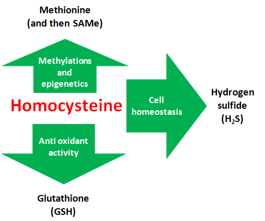 Homocysteine is disposed of in three different ways: i) it is re-methylated to methionine (methionine / folate / betaine cycle); ii) it is used to synthesize cysteine, this in turn is incorporated into proteins or used to synthesize GSH (antioxidant defenses); iii) two homocysteine molecules or a homocysteine and a cysteine can bind and in doing so release H2S. The micronutrients of Redostim supply all three of these homocysteine removal pathways and favor their “positive” reuse to feed methylations, antioxidant activity and H2S.