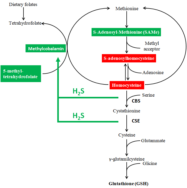 H2S is a powerful inducer of the carbon cycle (or methionine / folate cycle). The best-known reason for this effect is the induction of the activation of vitamin B12 to methylcobalamin, i.e. the form capable of passing the methyl group to homocysteine forming methionine. In turn, methylcobalamin will feed the methylations that are responsible for fundamental chemical syntheses (DNA, RNA, creatine, choline, CoQ, carnitine) and for DNA methylation in the context of epigenetic regulations.