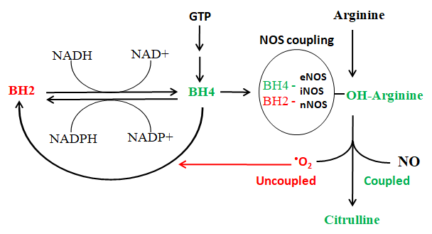 The synthesis of NO is complex and is performed by 3 enzyme isoforms of the nitric oxide synthase (NOS), respectively endothelial (eNOS), neuronal (nNOS) and inducible (iNOS). NOS metabolizes the amino acid arginine, transforming it first into hydroxy-arginine and then into citrulline. This step requires the presence of a cofactor, the tetrahydro-pteridine (BH4) which acts as an intermediate electron acceptor. In the presence of BH4 the NOS produce citrulline and NO. If, BH4 is present in its oxidized form, BH2, the reaction produces instead of NO the powerful radical superoxide anion (•O2). The superoxide anion goes to oxidize BH4 to BH2 creating a vicious circle that increasingly reduces the production of nitric oxide to the benefit of superoxide. BH2 can be reduced back to BH4 by the same enzyme that activates folates, DHFR.